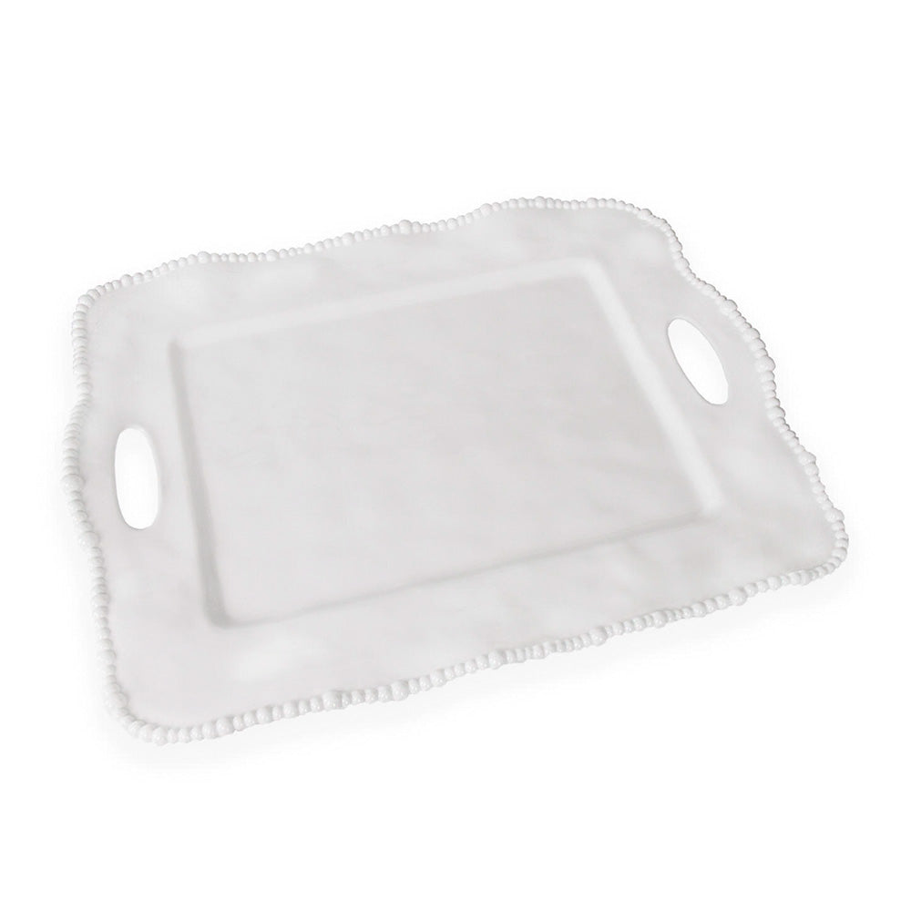 OPRAH'S PICK! An ample serving area and notched handles make this sparkling White Rectangular Tray with Handles a shining star in our innovative Alegria Collection, a luxury melamine line designed with distinctive Beatriz Ball flair. Fabulous for passing around snacks or drinks, the tray also makes a statement placed on the bar or kitchen island. Perfectly suited for indoor and outdoor entertainment, this Alegria tray is designed for everyday enjoyment. Pair the tray with other white melamine pieces for a coordinated serving set, or mix and match with items in four other colors for a festive and vibrant table display. Pairs well with items from Beatriz Ball’s signature metal line, too. Having the substance, weight and appearance of ceramics, this white melamine tray is as beautiful as it is versatile.