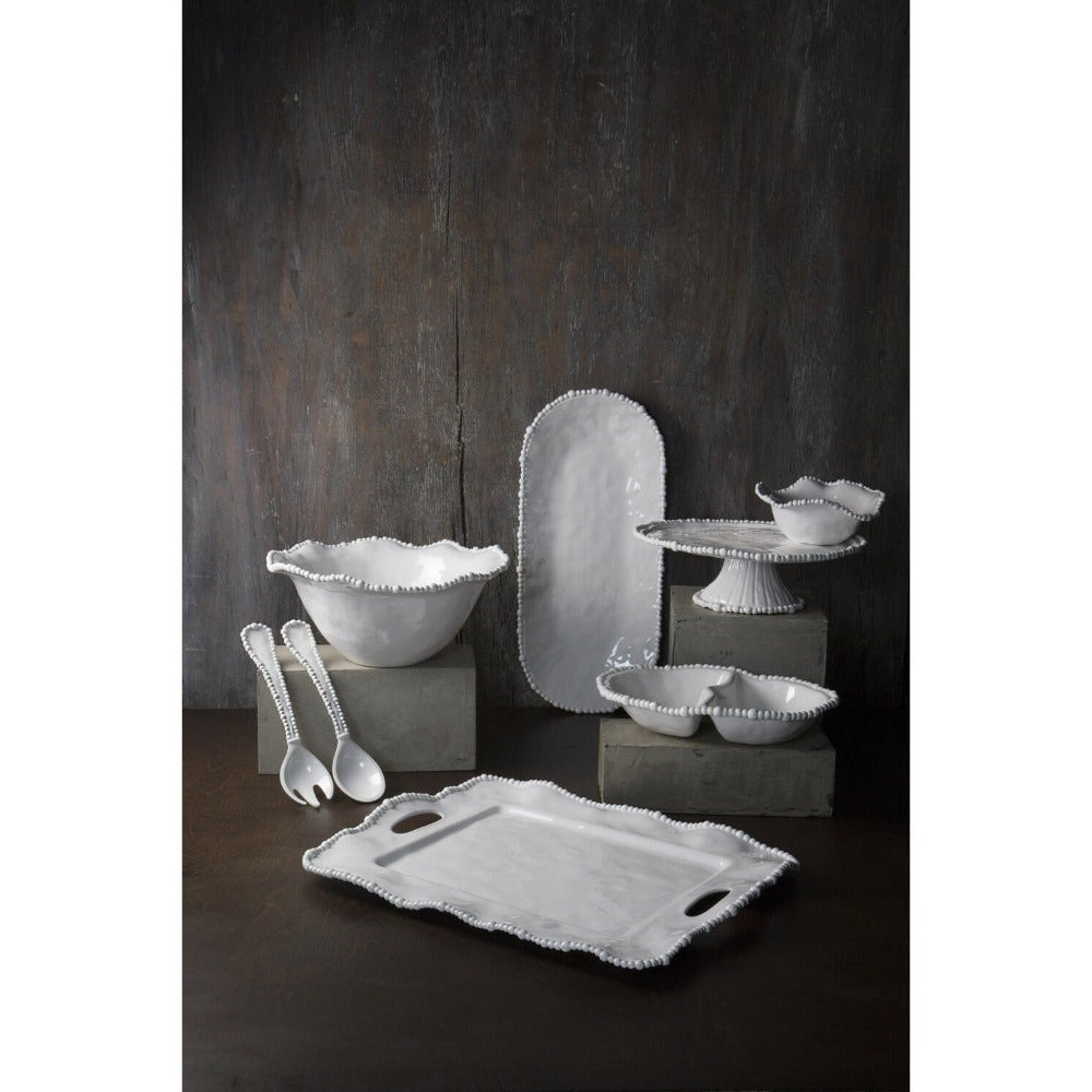 Melamine, reinvented. A brilliant white finish and pearl-rimmed styling make the Beatriz Ball Alegria Salad Servers the ideal choice for bowls in this collection of luxury melamine. The eye-catching servers have the appearance of ceramics, but are made of high quality melamine for everyday enjoyment. Perfectly suited for indoor and outdoor entertainment, Alegria is a collection as joyful as its name. Mix and match with our other colorful Alegria Collection items for a vibrant tablescape, or pair with our large white bowl for a great salad set. Decorative servers made of luxury melamine are always appreciated, so pair them with any bowls from the Alegria Collection for a great gift combo.