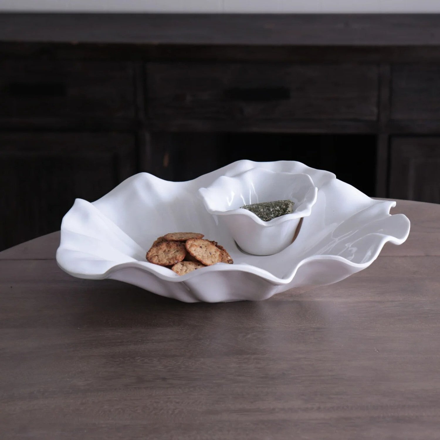 Beauty in full Bloom. Designers Beatriz Ball and Gretchen Murchison share a desire to create pieces that are beautiful as well as functional. That's why we've collaborated with the like-minded Louisiana-based ceramicist on the vibrant Bloom Collection. Rendered in the company’s signature sand-cast metal, in luxury melamine, and in acrylic, the Bloom Collection comprises sculptural bowls, platters and more inspired by floral and botanical forms. As with the other Bloom pieces, the dynamic design of the two-part VIDA Bloom Chip and Dip in luxury melamine features rippling petal-like movement, creating an eye-catching serving piece that combines beauty, artistry and functionality. Great on its own, or combined with other Bloom shapes and sizes, this handsome chip and dip will be the life of the party. Presented in a glistening white melamine with the look of ceramics. The dip bowl is detachable, and may be used on its own. Dishwasher safe (top rack), heavy-weight, break resistant and durable, food safe, BPA and PABA free.