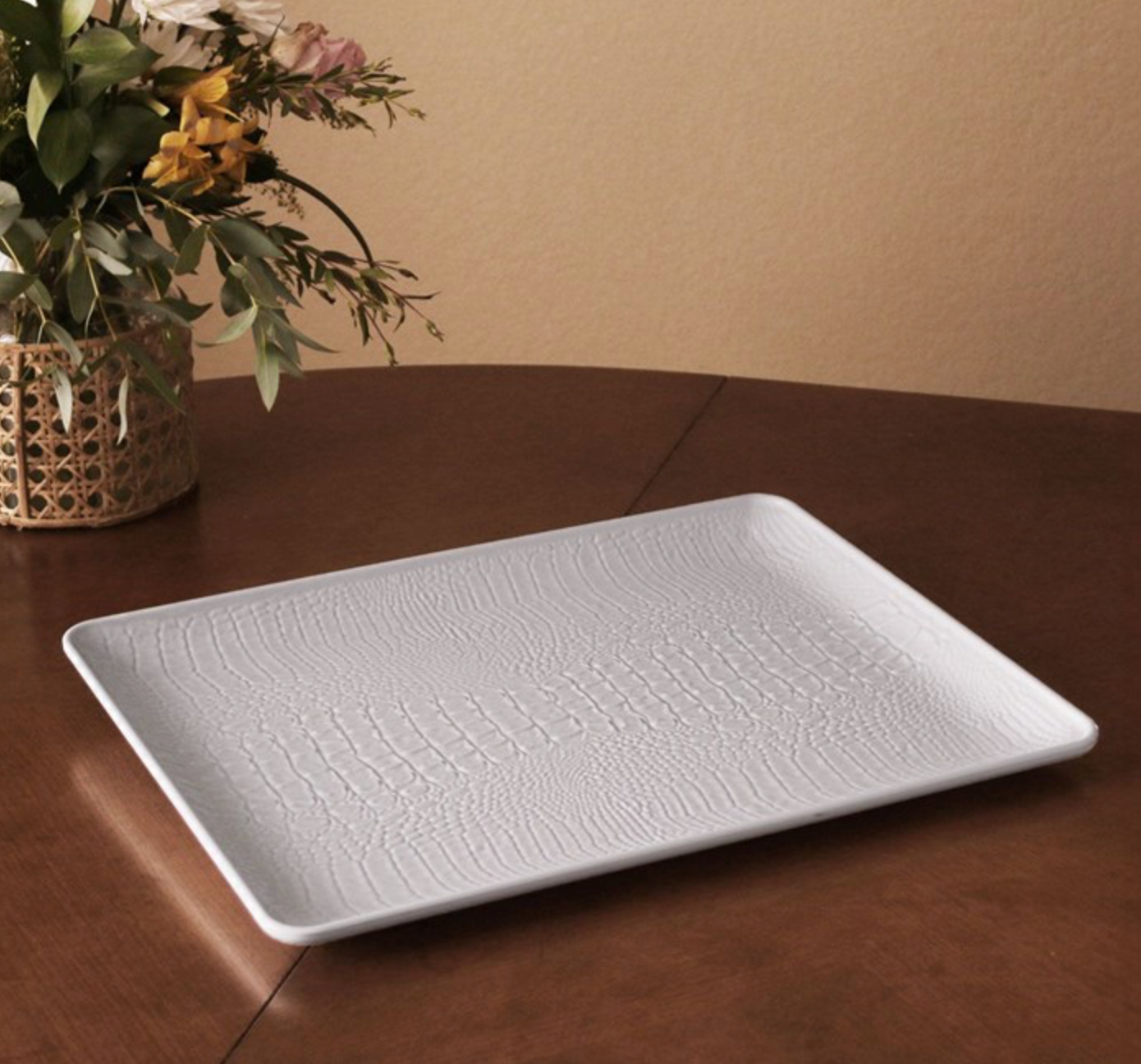Made of luxury melamine with a classic crocodile texture, our VIDA Croc Large Rectangular Tray (White) adds instant sophistication to your home entertaining. A clean and modern shape and robust texture combine for dramatic effect in this smart looking tray in luxury melamine. This handsome tray is supremely versatile and makes an attractive decorative accent. Looks great on the kitchen island, the bar, or the coffee table. A welcome gift for anyone on your list! Croc melamine ... clean, smart and fresh designs in an exciting new texture! Made of luxury melamine for everyday enjoyment, this piece is ideally suited for indoor and outdoor entertainment. Dishwasher safe (top rack), heavy weight, break resistant and durable, food safe, BPA and PABA free.
