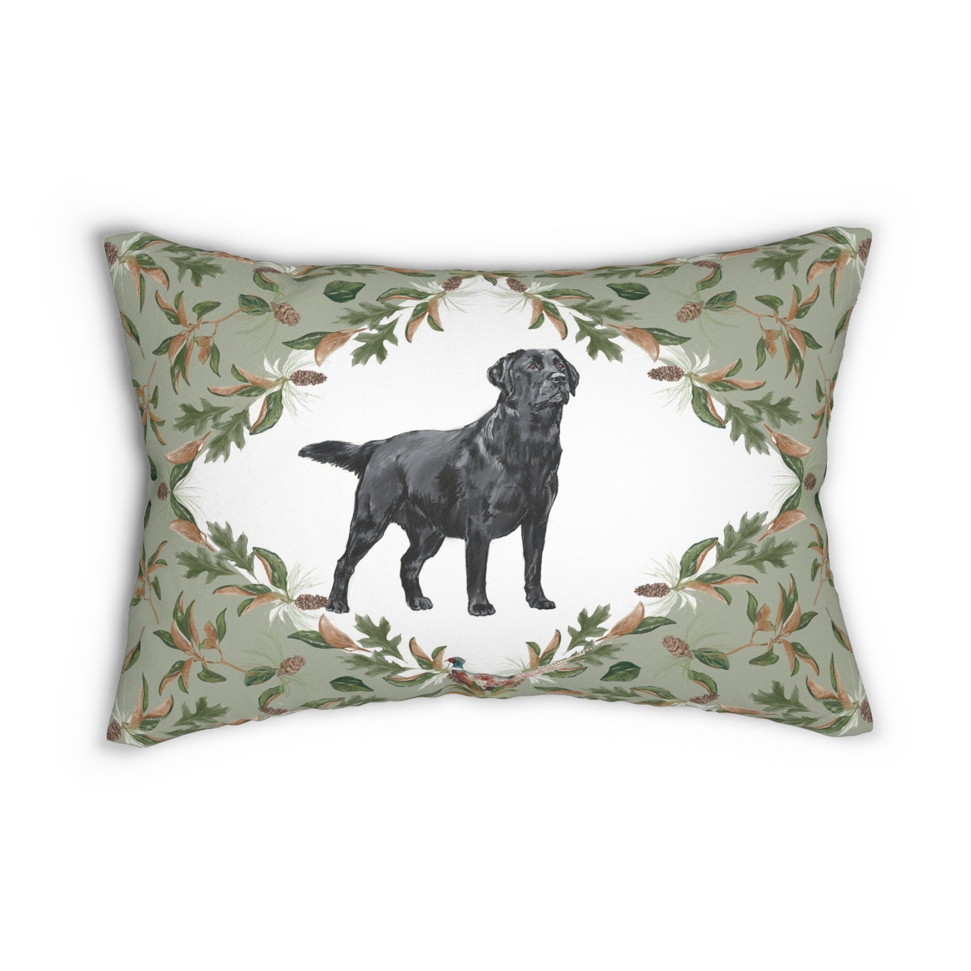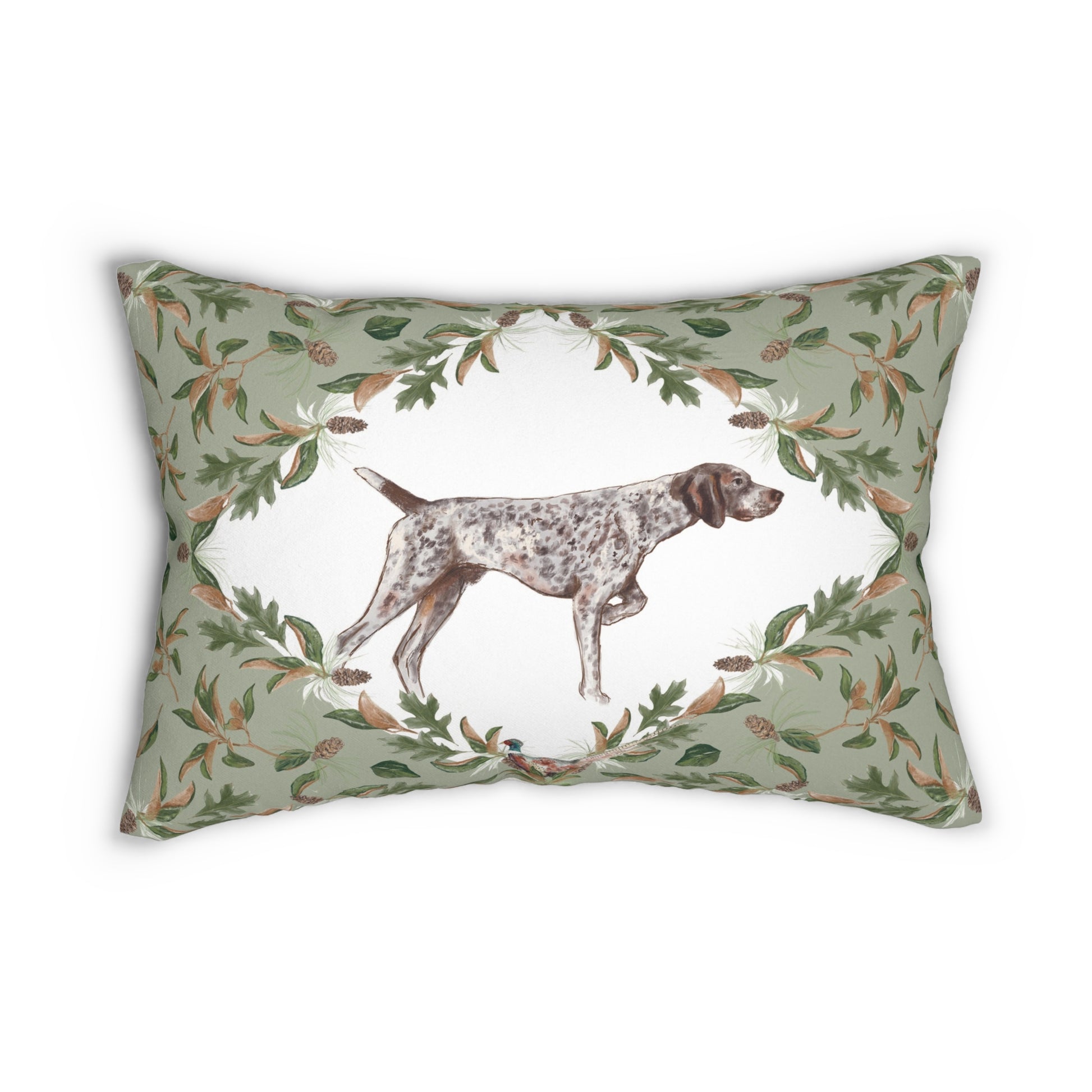 Celebrate the essence of autumn with our Woodland Pillows, featuring an elegant design that honors your appreciation for nature and cherished canine companions. Showcasing our shop pup Noli the Cavalier alongside her uncle, Buddy the Golden Retriever, together with a black lab, buck, and pointer, these covers introduce a refined, cozy ambiance to your home as the season turns cooler. The sophisticated autumn leaves toile pattern on a sage green background complements the soft, premium performance velvet, and filled with soft down feathers. A graceful way to welcome fall while paying tribute to your favorite dogs.