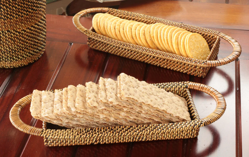 Natural cracker basket made by hand. Whether you serve this adaptable cracker tray with your wine or cheese display, you'll adore it. It precisely meets your cracker requirements! Single woven basket.